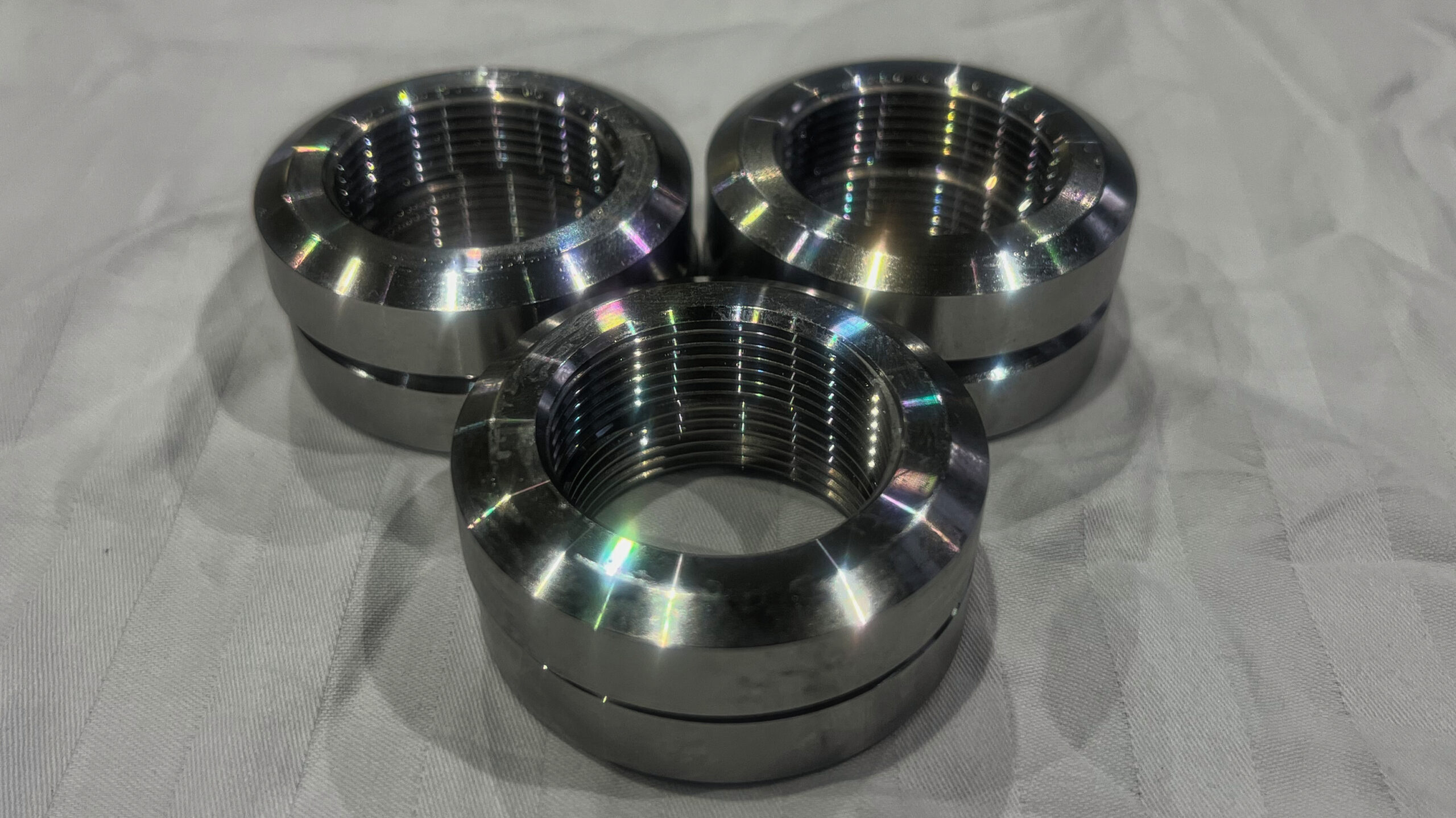 鉄素材から削り出し旋盤工程を行い寸法測定を経て複合加工機でタップ加工を行い、カエリチェックをし納品致します。