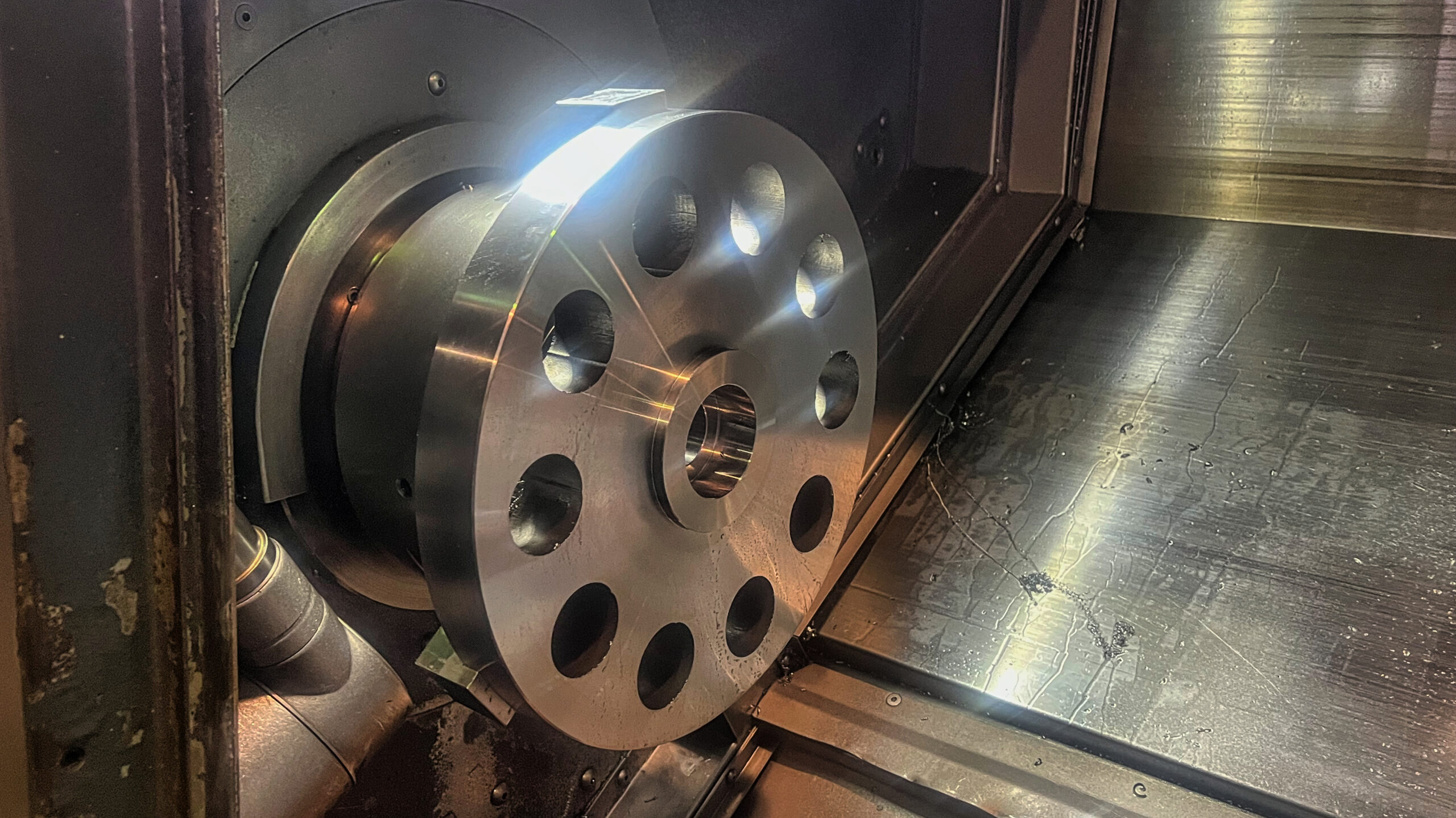 無垢の鉄素材から頂いた図面をもとに旋盤加工を経てマシニングセンタ、複合加工機で穴あけ等の追加工を行い、納品致します。